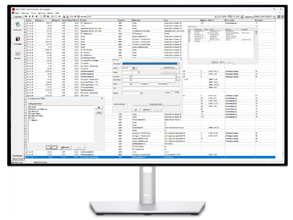 Die Curion Fibu mit geöffneter Buchungsmaske sowie Fenstern zur Auswahl von zu kopierenden Feldern (unten links) und Auswahl von Standardbuchungen (oben rechts)
