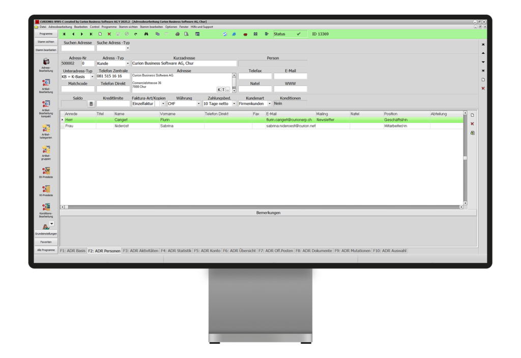 In der Adressmaske bei der Adressverwaltung von curionERP sehen Sie sofort, was relevant ist. Ansprechpartner, offene Geschäftsvorfälle, Dokumente, letzte Einkäufe oder interne Notizen stehen übersichtlich zur Verfügung.